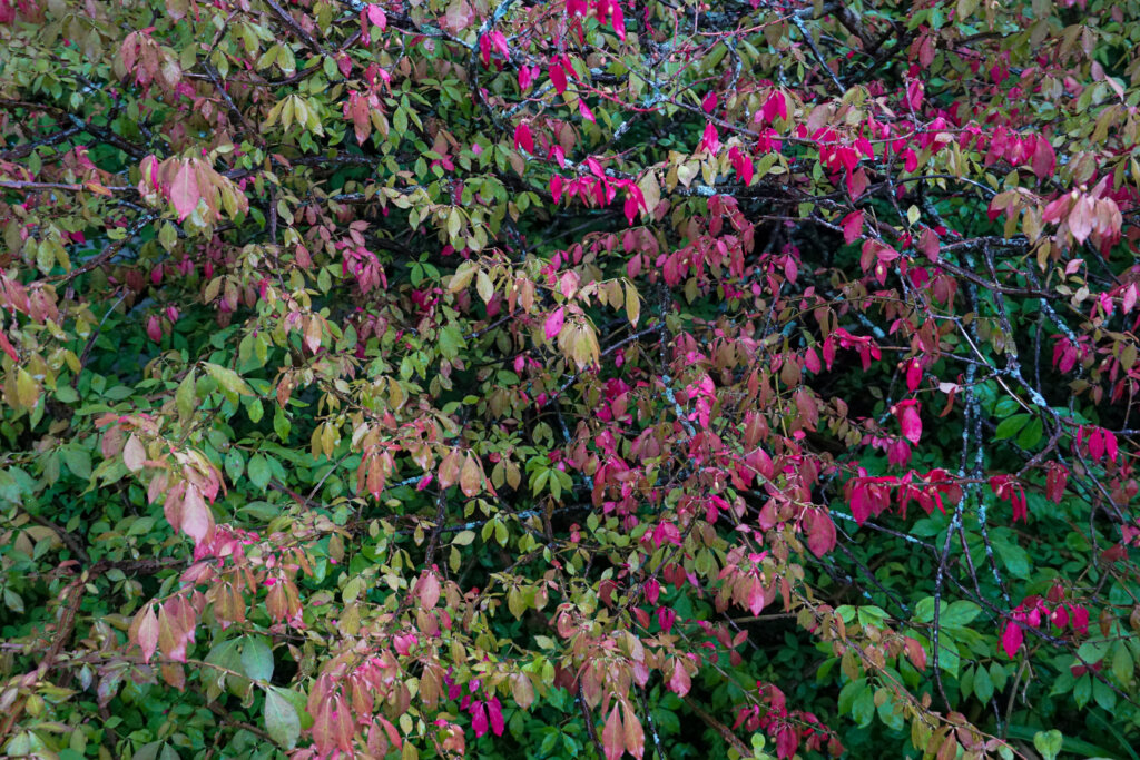 The first few bright spots of color around the base area are the maple trees, currently displaying varying degrees of green-to-red gradient. Bushes planted around the base area are beginning to turn their leaves as well, and listed below are three specific plants that stand out in their early foliage blooms this year.